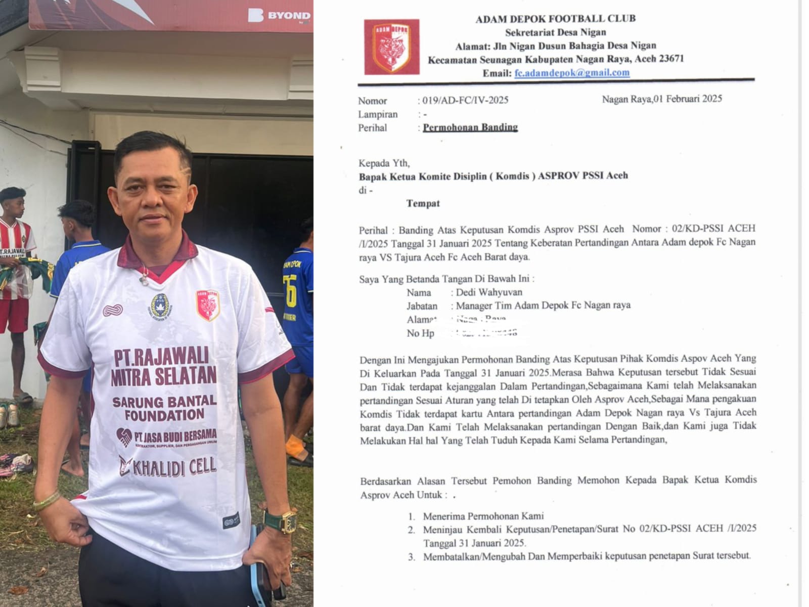 Dedi menyebutkan, Adam Depok FC telah mengajukan permohonan bading terhadap Komdis Aceh, dengan nomor 019/AD-FC/IV-2025.