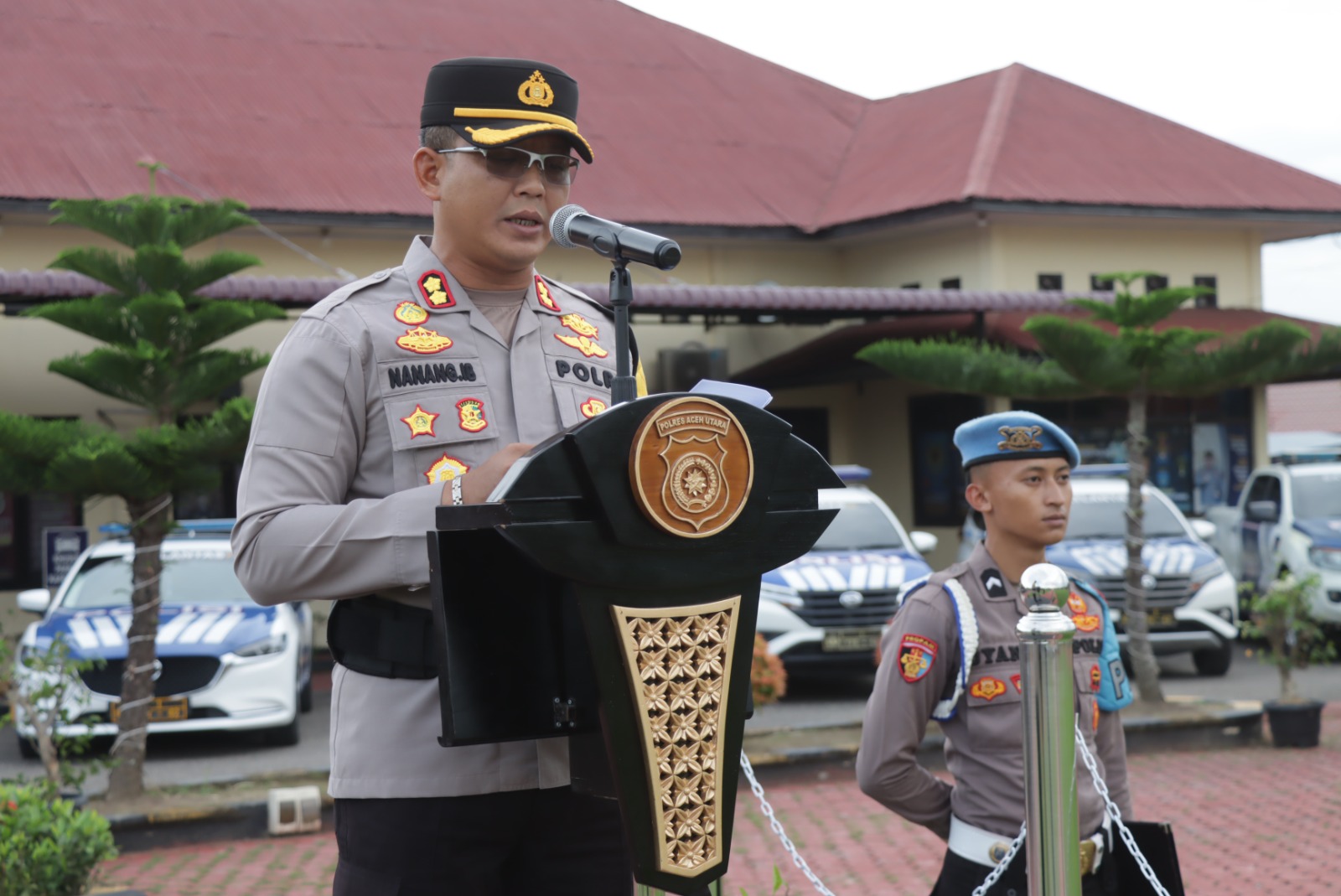 Apel gelar pasukan ini ditandai dengan pemasangan pita secara simbolis kepada perwakilan serta pemeriksaan pasukan oleh Kapolres Aceh Utara yang didampingi Komandan Apel.