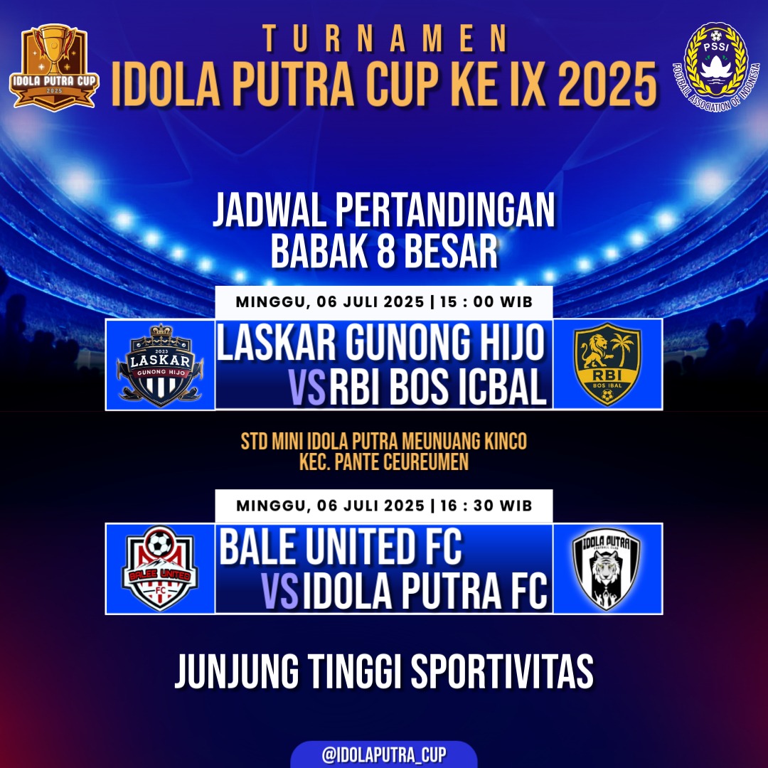 Aceh Barat | AtjehTerkini.id – Turnamen sepak bola paling bergengsi di wilayah Barat Selatan Aceh, Idola Putra Cup ke IX 2025, memasuki babak 8 besar. Dua pertandingan panas bakal tersaji pada Minggu, (6/7/2025), di Stadion Idola Putra, Gampong Meunuang Kinco, Kecamatan Pante Ceureumen, Aceh Barat.