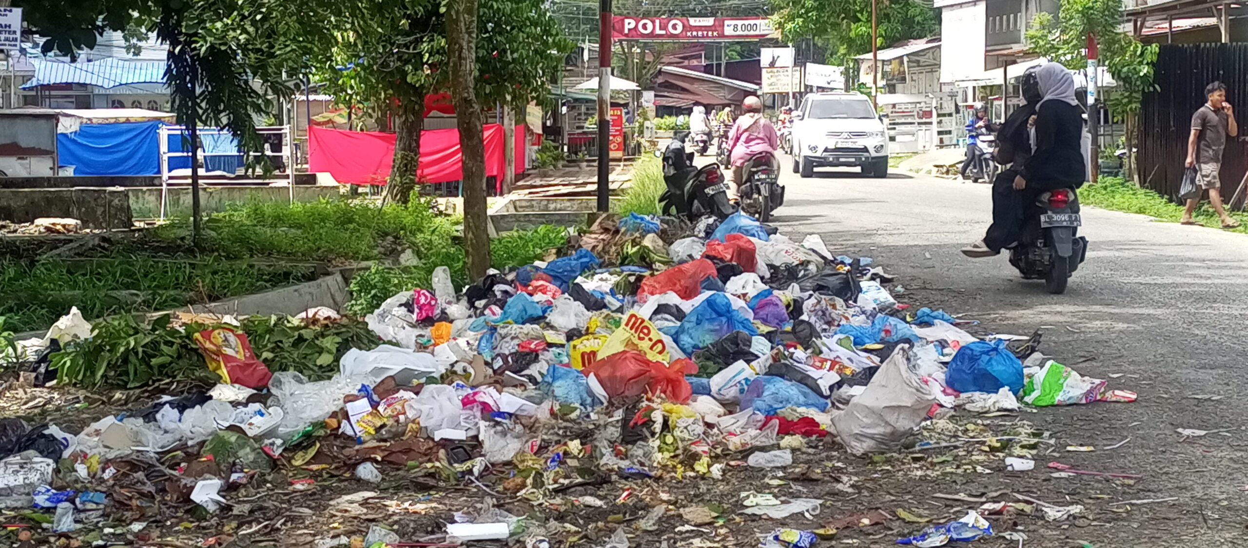 Terpantau, tumpukan sampah berserakan, menimbulkan bau menyengat. Sangat menggangu masyarakat sekitar dan penguna jalan ketika melintas di kawasan tersebut.