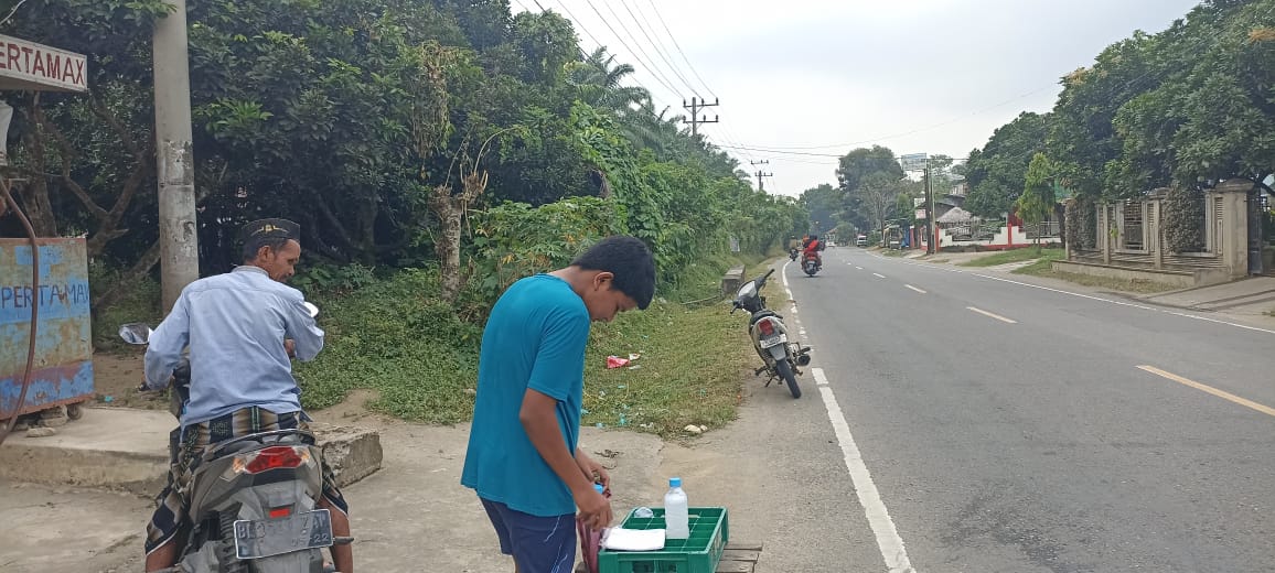 Sesekali dia menawarkan kepada warga yang melintas. Pekerjaan ini ia lakoni guna membantu ayahnya mengais rezeki di bulan Ramadhan 1446 H.