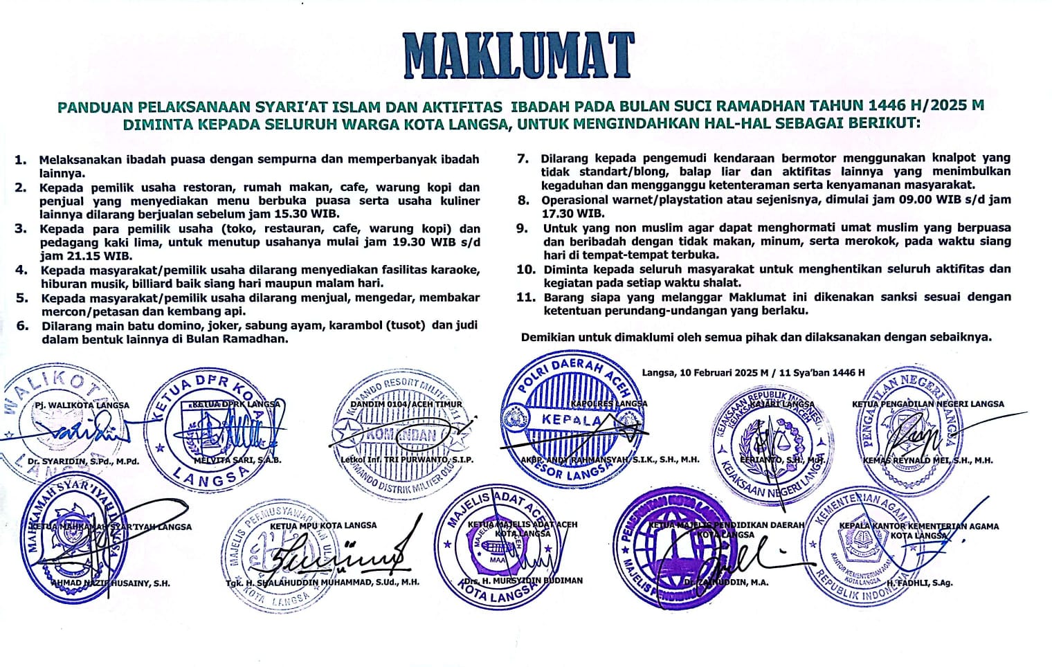 Langsa| Atjeh Terkini.id – Jelang bulan suci Ramadan 1446 Hijriah/2025 M, Pemerintah Kota (Pemko) Langsa keluarkan maklumat berupa panduan pelaksanaan Syariat Islam serta aktifitas ibadah dan diminta kepada seluruh warga Kota Langsa mematuhinya, Selasa, (25/2/2025).