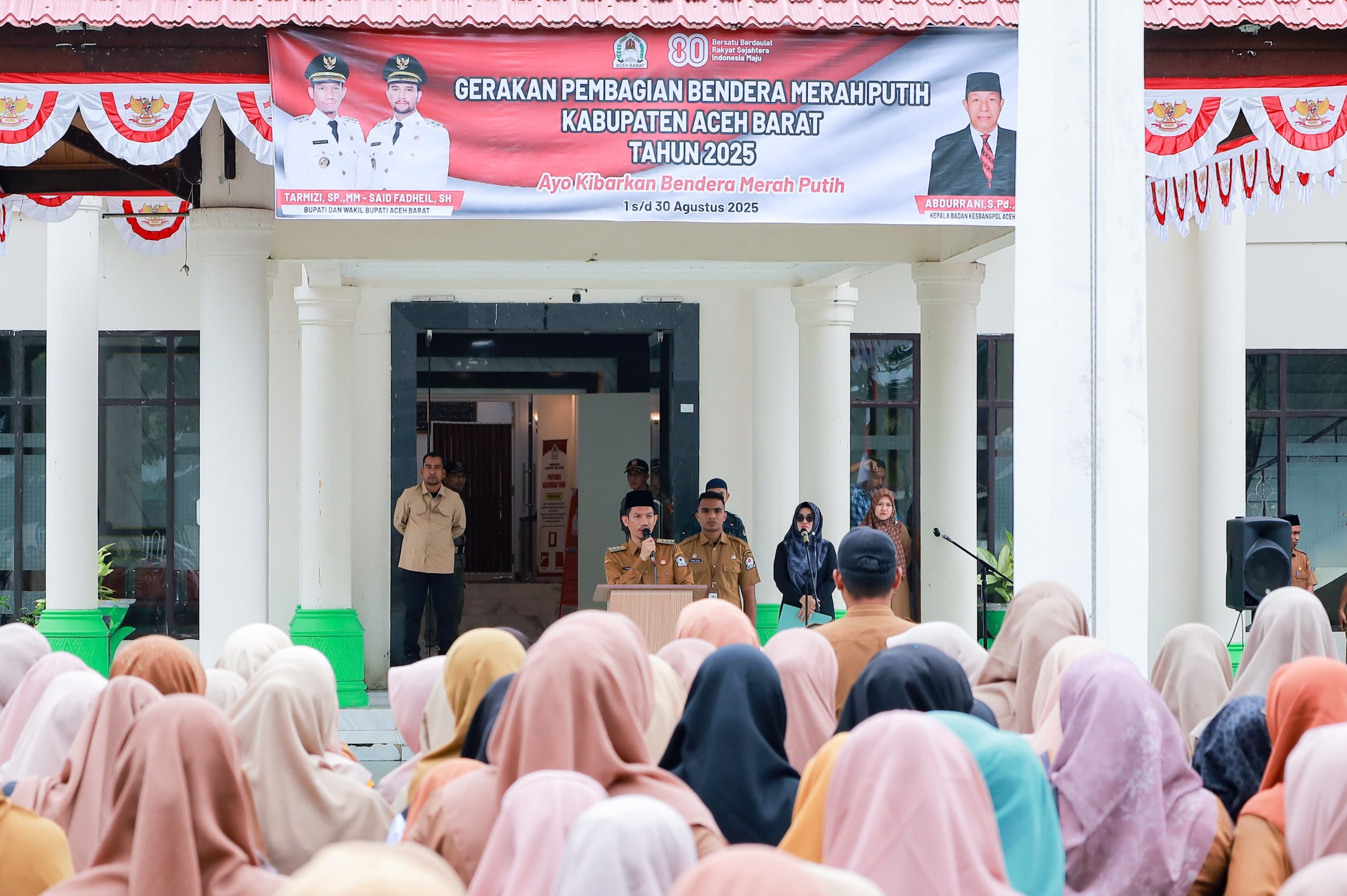 Meulaboh | Atjehterkini.id – Bupati Aceh Barat, Tarmizi SP MM, memimpin apel gabungan seluruh Satuan Kerja Perangkat Kabupaten (SKPK) dan perwakilan kecamatan di lapangan upacara Kantor Bupati, Senin pagi (11/8/2025).