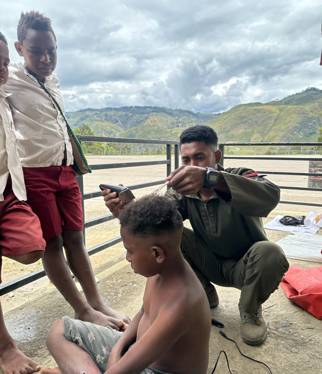 Kegiatan yang bertajuk Pangkas Rambut Anak-anak Papua ini berlangsung di Pos Blukar 6.7, Tiom, pada Jumat, 14 Maret 2025.