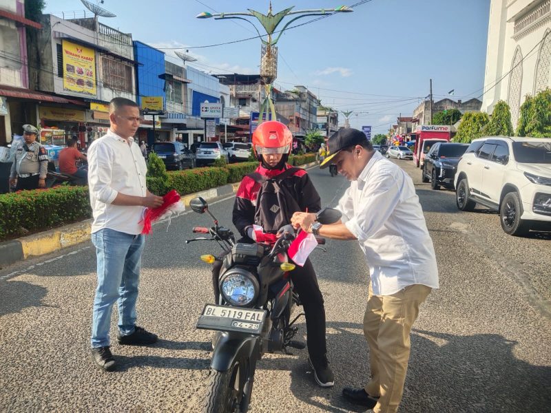 Langsa | Atjeh Terkini.id – DPC Partai Gerindra Kota Langsa membagikan sebanyak 500 lembar Bendera Merah Putih kepada pengguna sepeda motor dan mobil yang melintasi jalan A Yani persis persimpangan lampu merah depan RSUD Langsa, Selasa, (12/8/2025) sore.