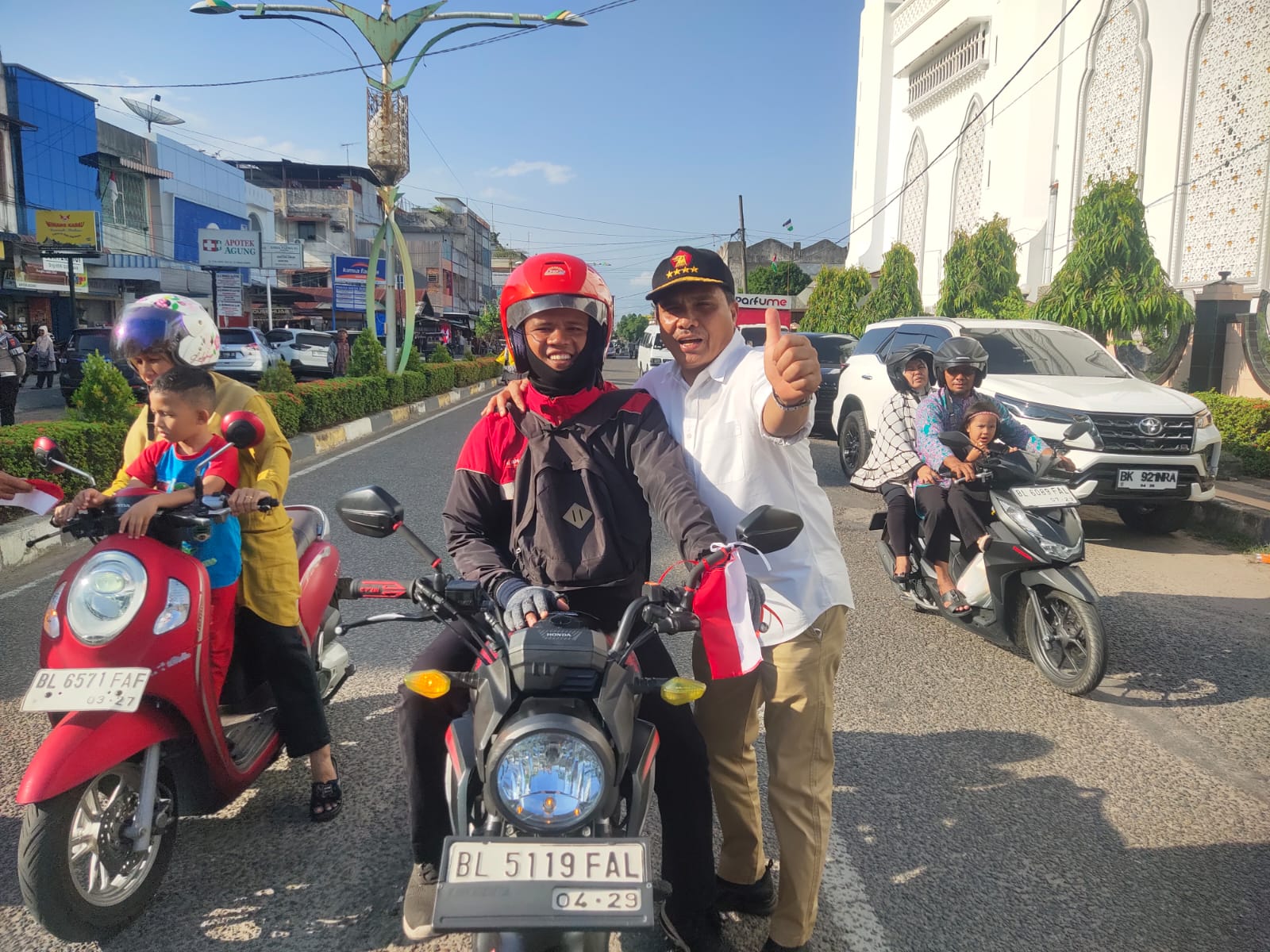 Senada, Anggota DPRK Langsa, Muhammad Razi, saat membagikan bendera merah putih menyatakan bahwa pembagian bendera ini adalah instruksi dari pusat yang dibagikan secara gratis bagi warga pengguna sepeda motor maupun mobil yang melintas.