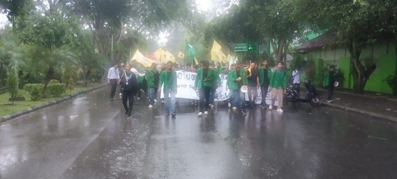 Langsa | Atjeh Terkini.id – Ratusan mahasiswa di Kota Langsa melakukan aksi unjuk rasa ditengah lebatnya hujan didepan Gedung DPRK Langsa.
