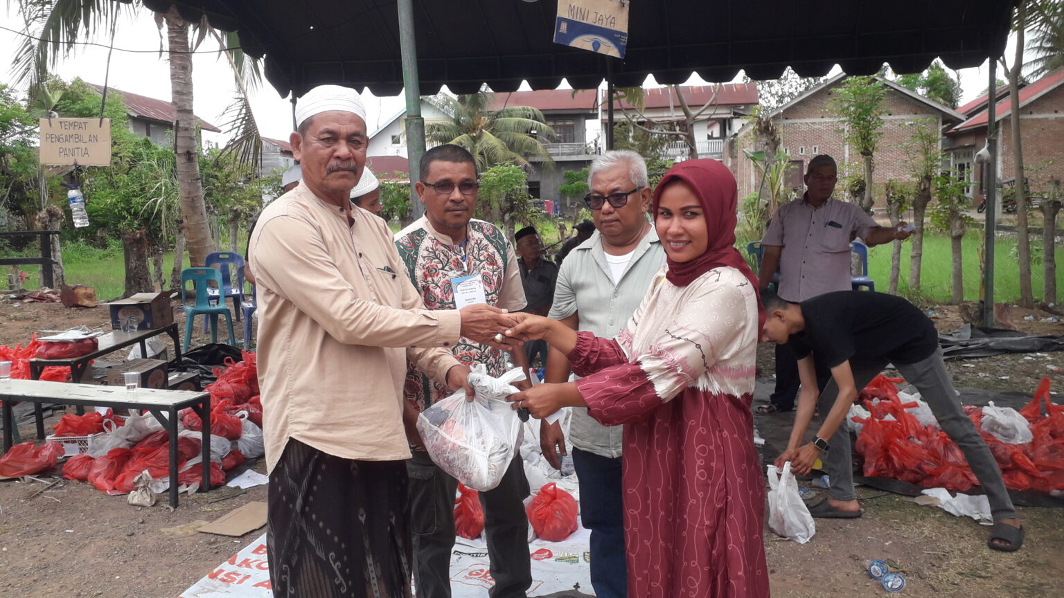 penyerahan daging Qurban secara Simbolis kepada masyarakat oleh Keuchik Gampong Batoh Djafaruddin, didampingi Kepala Dusun Mini Jaya, Sofyan, serta Ketua Penitia penyembelihan Hewan Qurban H. Arman Sofyan. Senin 17/06/2024.