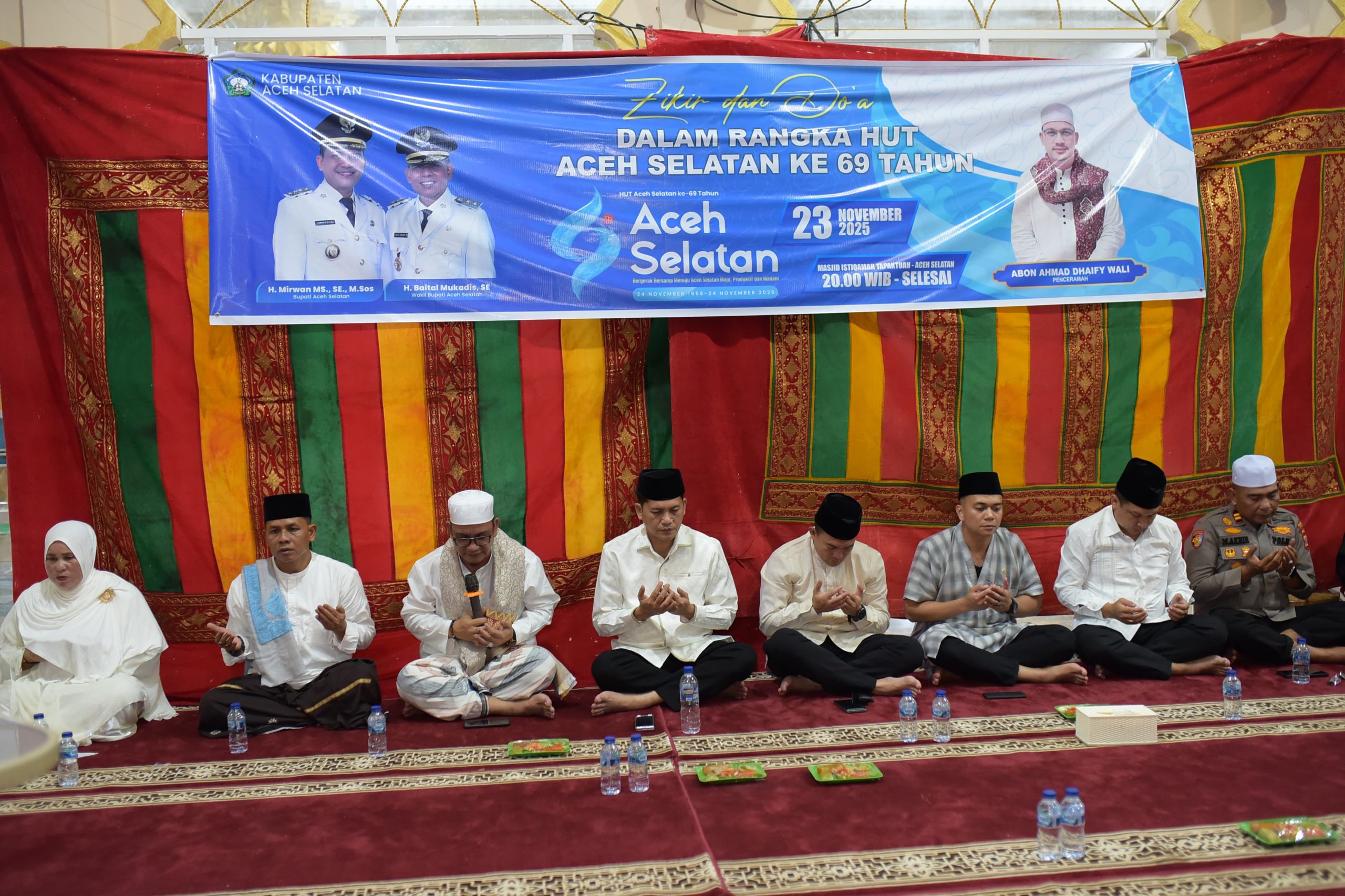 Tapaktuan | Atjeh Terkini.id – Pemerintah Kabupaten Aceh Selatan menggelar acara Doa dan Zikir bersama dalam rangka memperingati Hari Jadi ke-69 Kabupaten Aceh Selatan, pada Minggu malam (23/11/2025). Kegiatan berlangsung khusyuk di Masjid Istiqamah Tapaktuan mulai pukul 20.30 WIB hingga selesai.