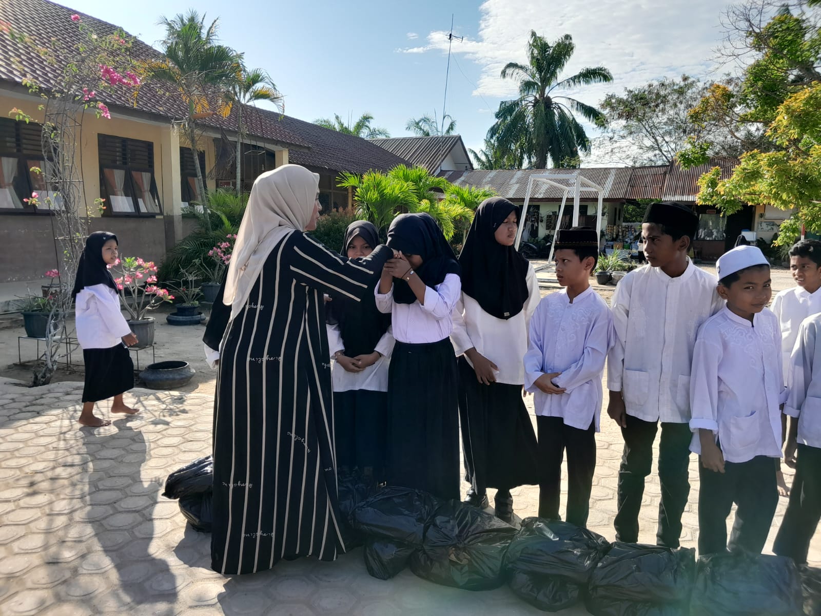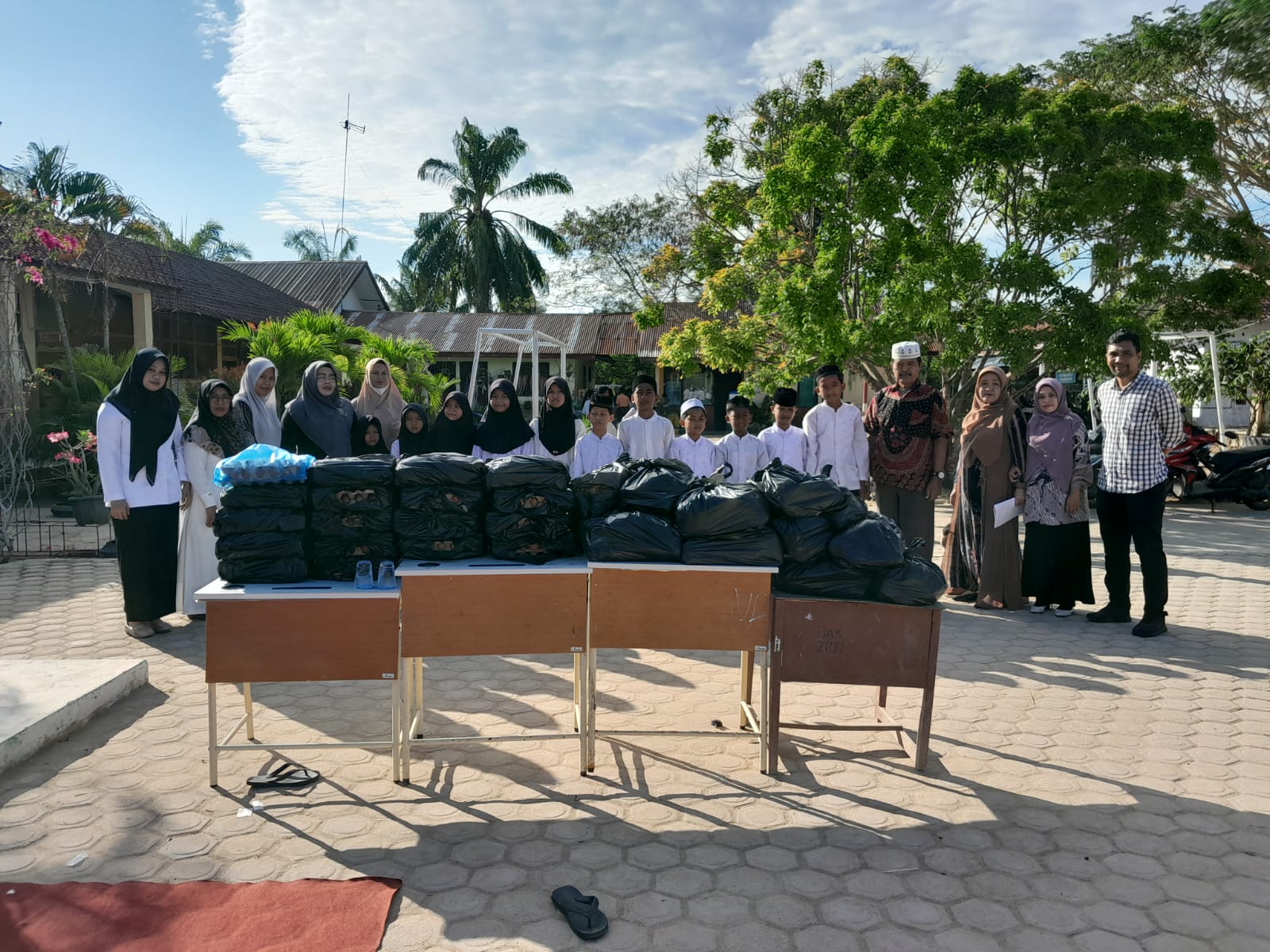 Dikatakan, sumbangan ini berasal dari sumbangan murid dan para dewan guru. Adapun santunan yang diberikan berupa sembako yaitu, gula, beras, minyak goreng, telur.