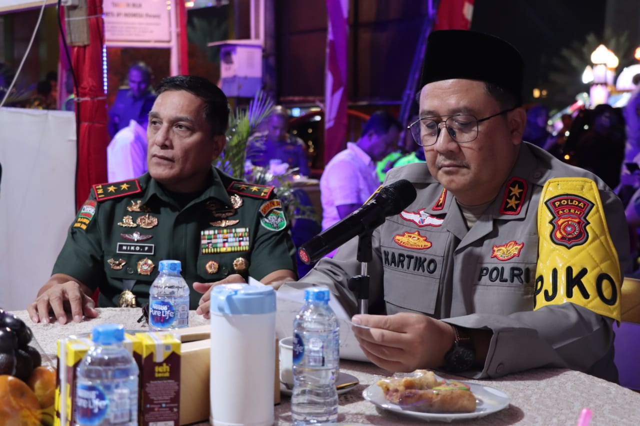 Banda Aceh | Atjeh Terkini.id — Kapolda Aceh, Irjen Dr. Achmad Kartiko bersama Pangdam Iskandar Muda (IM) Mayjen TNI Niko Fahrizal dan unsur Forkopimda lainnya mengikuti video conference (vidcon) dengan Kapolri Jenderal Listyo Sigit Prabowo di Pos Pengamanan Mall Barata, Kota Banda Aceh, pada Ahad malam, 30 Maret 2025.