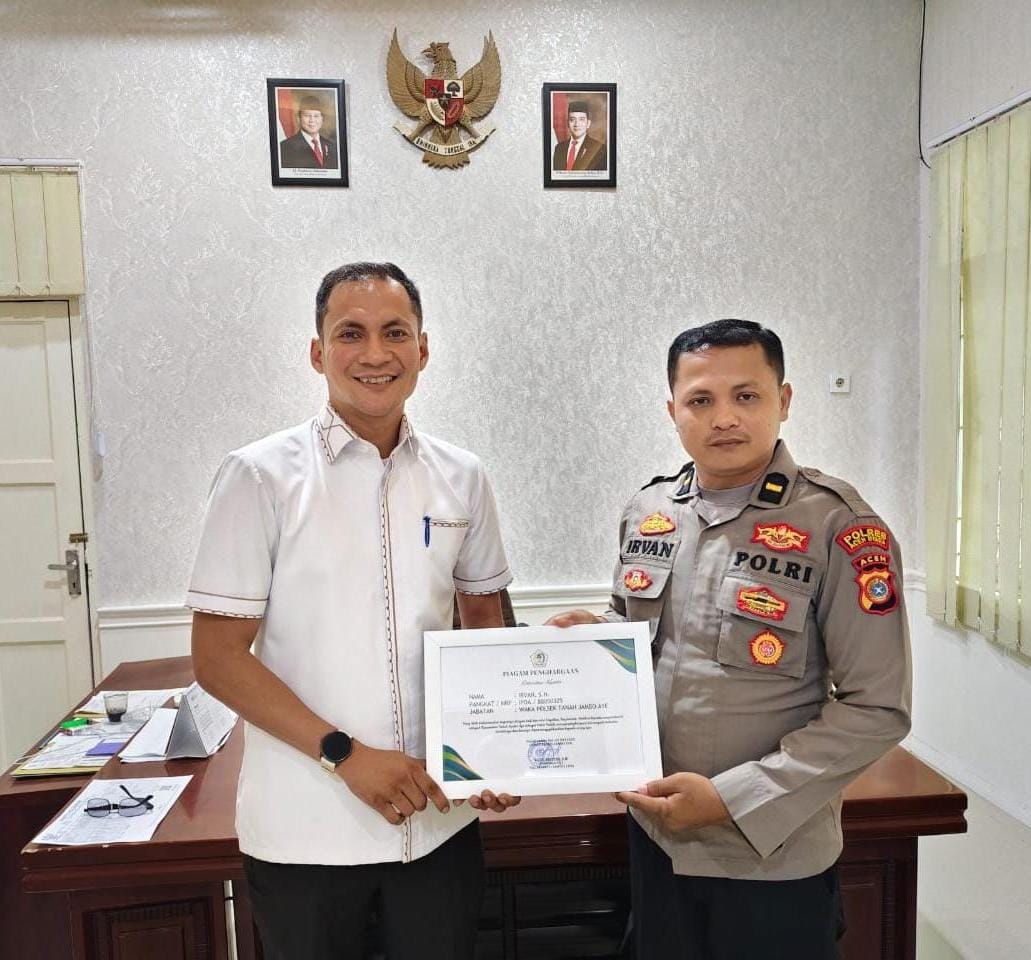 Aceh Utara | Atjeh Terkini.id – Atas dedikasi dan kiprahnya dalam aksi-aksi sosial kemanusiaan, Wakil Kepala Polsek Tanah Jambo Aye, Ipda Irvan, S.H kembali menerima penghargaan dari Camat Tanah Jambo Aye, Aceh Utara, pada Rabu (14/05/2025).
