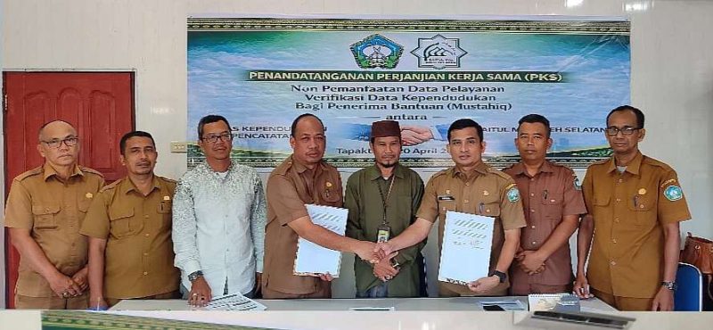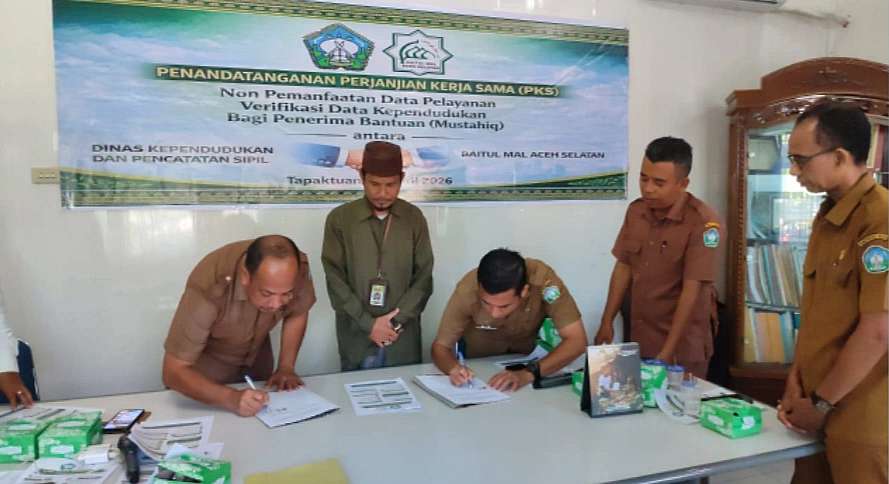 Dinas Kependudukan dan Pencatatan Sipil (Disdukcapil) dengan Baitul Mal Kabupaten Aceh Selatan resmi meluncurkan SIM-MAS TERPADU (Sistem Integrasi Layanan Mustahiq, Masyarakat, dan Administrasi Kependudukan) melalui penandatanganan Perjanjian Kerja Sama (PKS) yang berlangsung di Kantor Disdukcapil Aceh Selatan, Senin (20/4/2026).