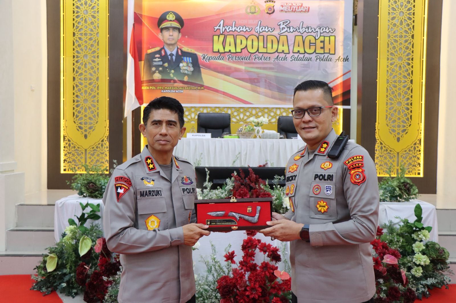 Usai memberikan arahan, Kapolda Aceh menyerahkan penghargaan kepada personel Polres Aceh Selatan yang berprestasi dalam pelaksanaan tugas sebagai pelindung dan pengayom masyarakat. Selanjutnya Kapolres Aceh Selatan Berikan Cendera mata berupa rencong kepada Kapolda Aceh sebagai ucapan terima kasih atas kunjungan ke Polres Aceh Selatan.