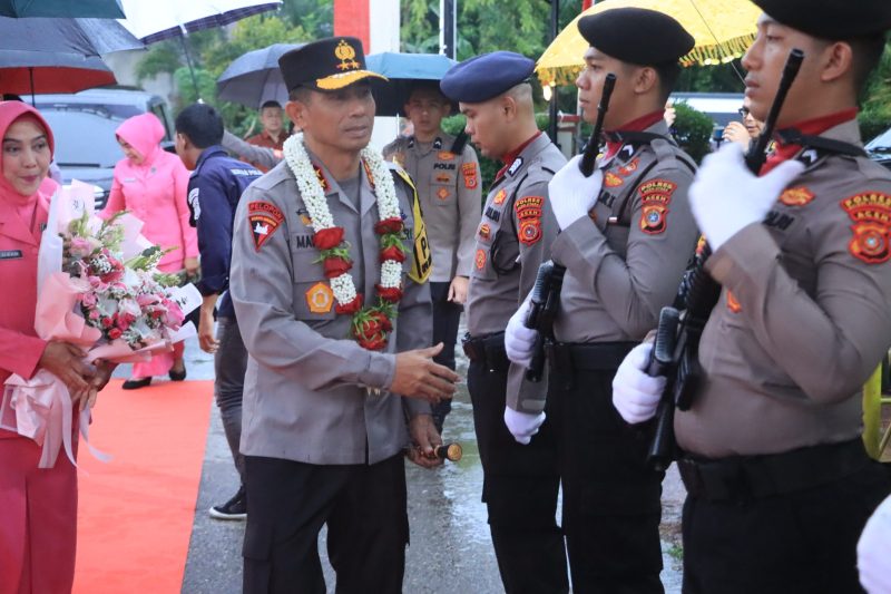 Meskipun suasana pagi di Mapolres Aceh Utara diguyur hujan, namun rangkaian penyambutan bersama unsur Forkopimda dan tokoh agama setemapat tetap berlangsung khidmat diwarnai prosesi “peusijuk” oleh Waled Lapang kepada Kapolda dan Istri di gedung utama Mapolres.
