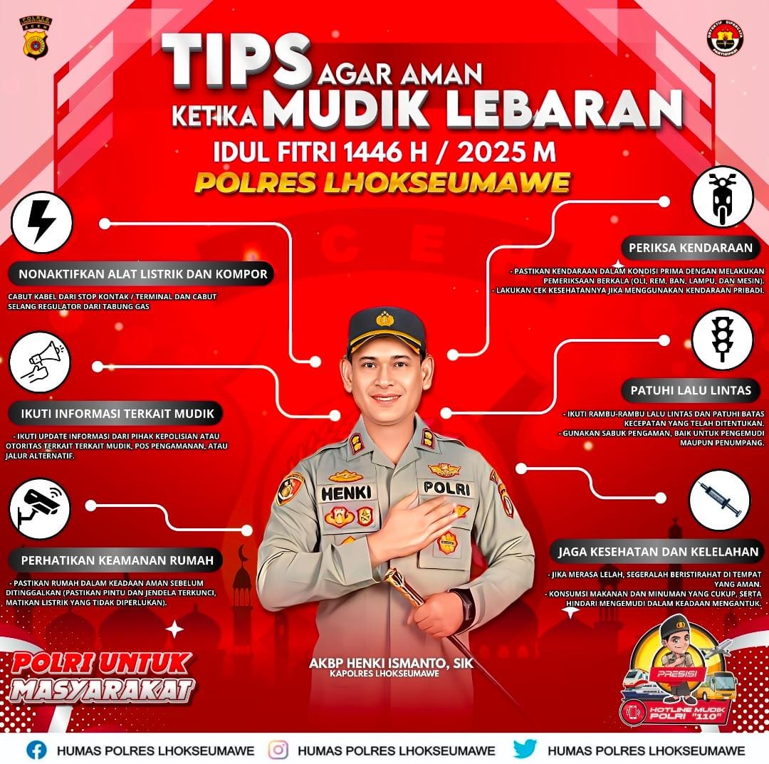 Melalui infografis yang dirilis oleh Humas Polres Lhokseumawe yang dipublis di berbagai media sosial tersebut, masyarakat diimbau untuk memperhatikan berbagai aspek keselamatan sebelum dan saat mudik.