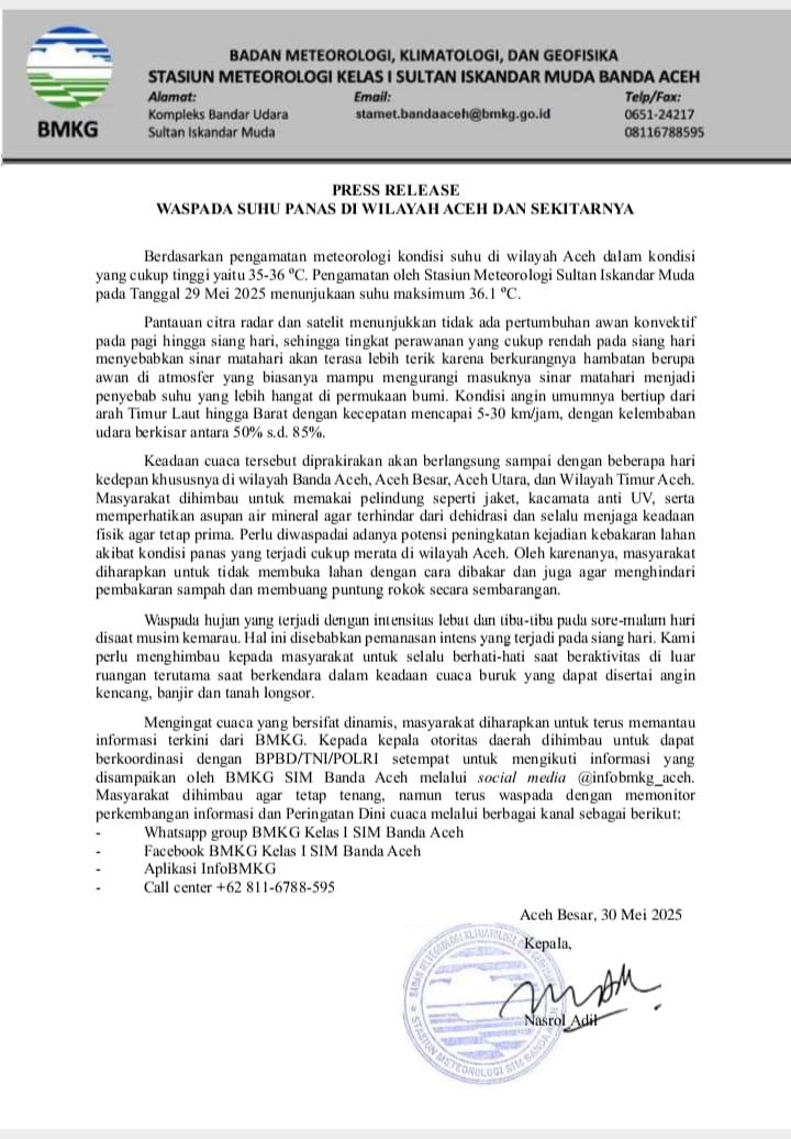 Pernyataan Rajab sejalan dengan peringatan resmi yang disampaikan oleh BMKG Stasiun Meteorologi Sultan Iskandar Muda terkait suhu ekstrem di wilayah Aceh yang mencapai 36,1°C. Kondisi langit cerah dan minim awan menyebabkan sinar matahari masuk secara maksimal ke permukaan bumi tanpa penghalang, sehingga menimbulkan efek panas yang menyengat.