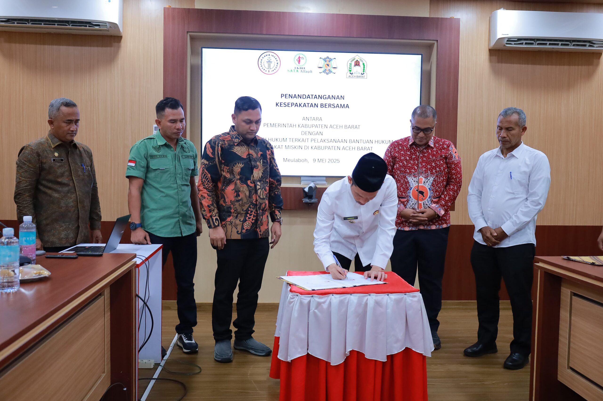 Meulaboh | Atjeh Terkini.id – Pemerintah Kabupaten Aceh Barat menandatangani kesepakatan bersama dengan tiga lembaga hukum untuk memberikan layanan bantuan hukum gratis kepada masyarakat miskin. Penandatanganan berlangsung di ruang rapat Teuku Umar, Kantor Bupati Aceh Barat, Jumat (9/5/2025).