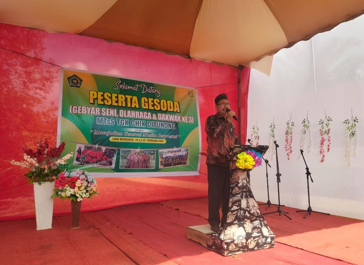 Sebelumnya, Ketua panitia Rasyina, S.Pd.I., M.Pd dalam laporannya menyampaikan, Gesoda ke-3 MTsS Tgk Chik Ditunong berlangsung selama 4 hari, mulai tanggal 19 hingga 22 Pebruari 2025, melibatkan 10 SD/MI di kecamatan Tanah Jambo Aye dan Langkahan.
