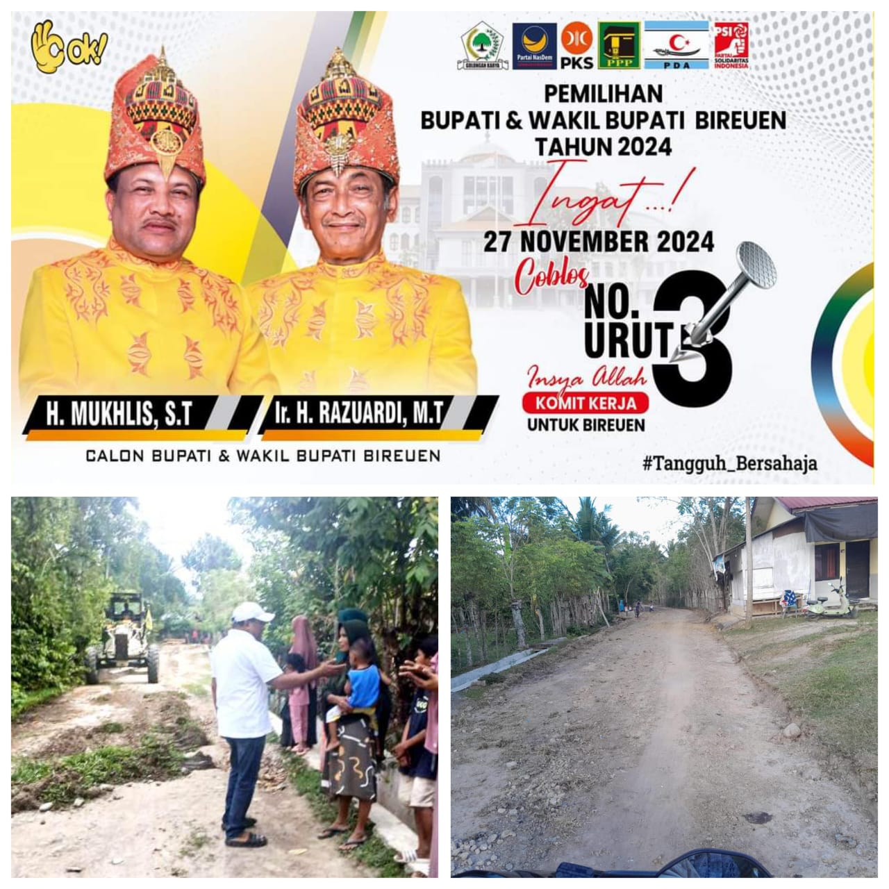 Mukhlis yang murah hati selaku Calon Bupati Bireuen berpasangan dengan Razuardi, didampingi sejumlah tim Pemenangan Paslon Bupati dan Wakil Bupati Bireuen nomor urut 3, setelah berkunjung ke Gampong Lhok Dagang,menurunkan alat berat.Kamis (31/10/2024).