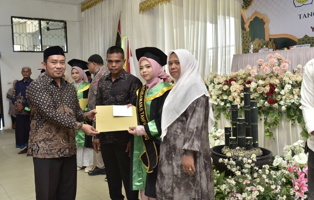 Ketua Umum Yayasan Dayah Bustanul Ulum, Drs. H. Faisal Hasan ZZ, didampingi Sekretaris, Ustadz Dede Gustian, Kepala Madrasah, Ustadz Bahauddin S.Pdi, M.Ag, Abu Chik Dayah, Ustadz Samsuria S.Ag, MPd, dan Kepala Aliyah, Rafida Hanum saat penyerahan sertifikat kepada Alimira Sofia dalam wisuda tersebut, di aula MUQ setempat, Kamis, 16 April 2026 kemarin. foto/ist.