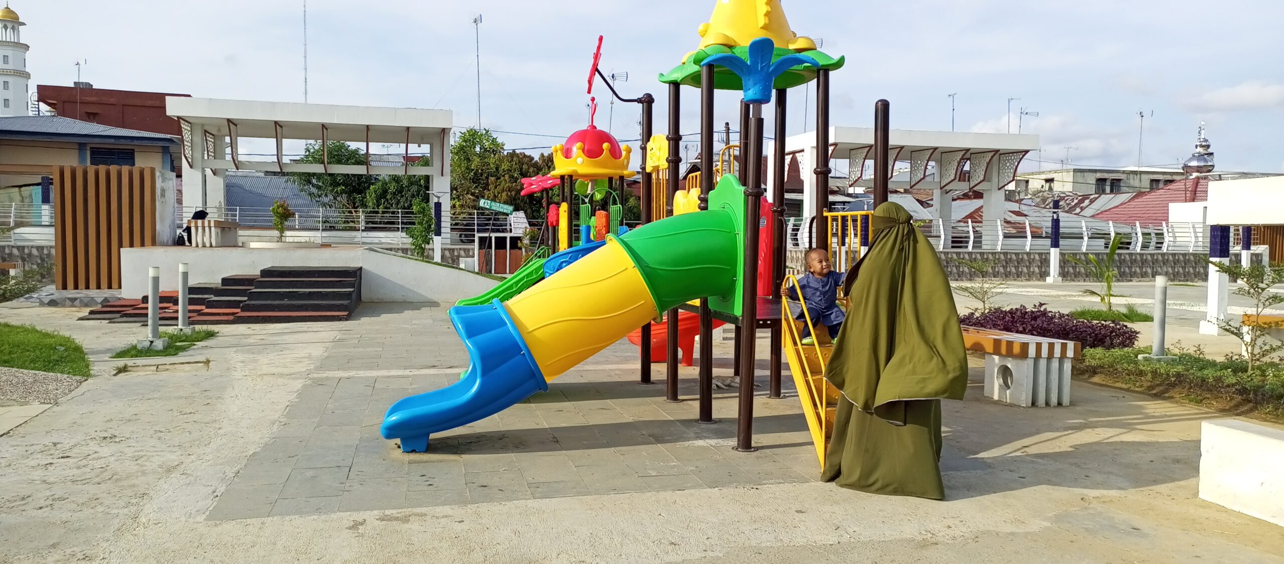 “Taman ini dilihat dari bangunannya sebagai tempat bermain anak juga bisa menjadi tempat bersantai melepas lelah bagi para orang tua,” ujar Bang Oyi.