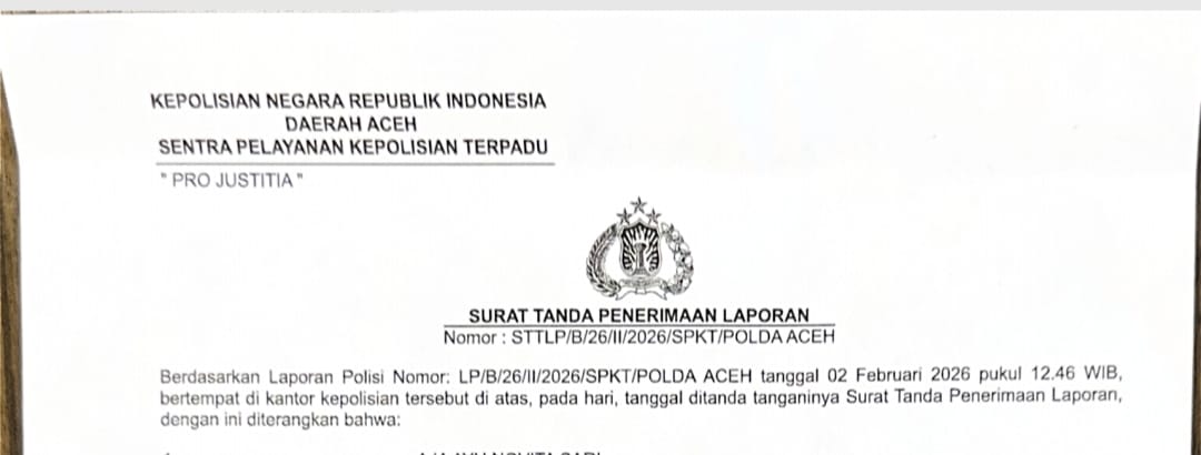 Atas kejadian tersebut, korban didampingi keluarga melaporkan kasus ini ke Sentra Pelayanan Kepolisian Terpadu (SPKT) Polda Aceh. Laporan resmi tercatat dengan nomor STTLP/B/26/II/2026/SPKT/Polda Aceh, tertanggal 2 Februari 2026, untuk diproses sesuai hukum yang berlaku.