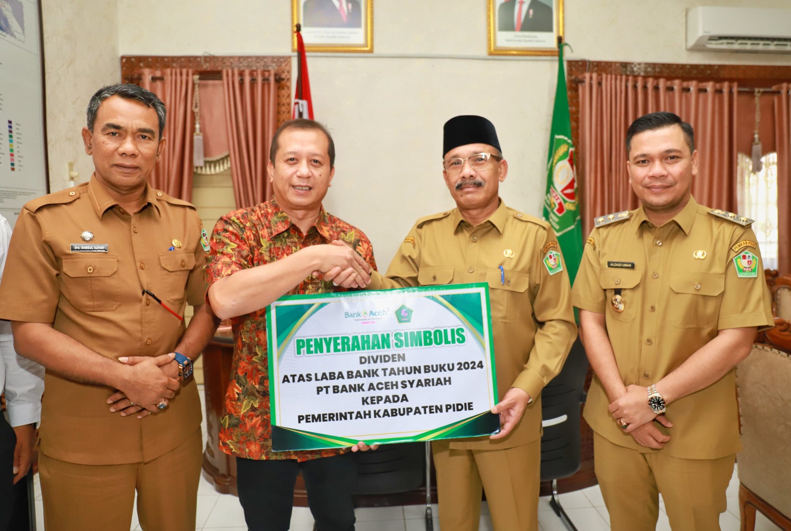 Dividen atas penyertaan modal tersebut diserahkan langsung oleh Pimpinan Bank Aceh Syariah Cabang Pidie Muhammad Husni Saputra kepada Bupati Pidie H. Sarjani Abdullah, SH yang berlangsung di ruang kerja bupati, Senin, (10/03/2025).