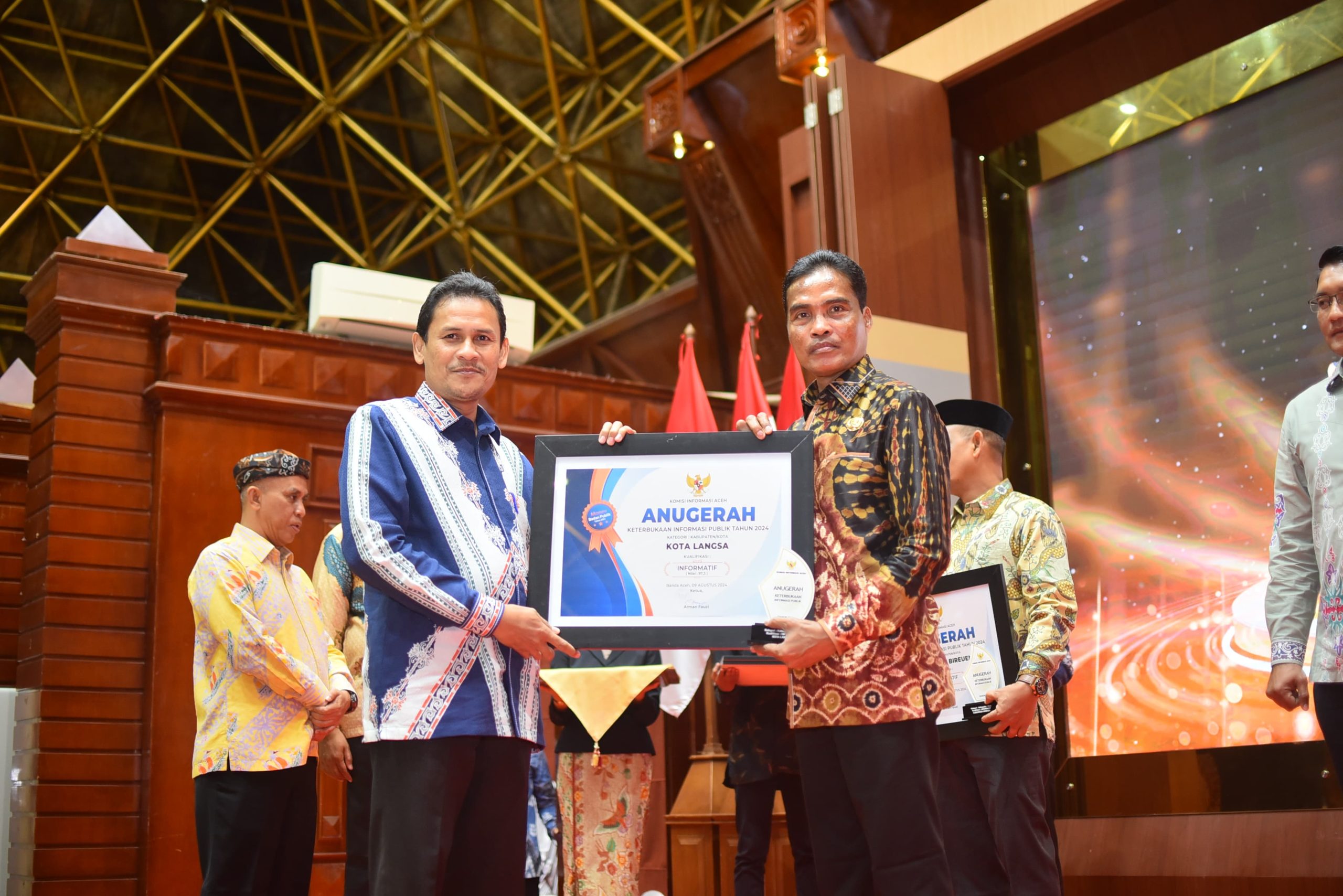 Diserahkan pada malam Penganugerahan Keterbukaan Informasi Publik Tahun 2024 oleh Pj Gubernur Aceh Dr. Safrizal ZA, M.Si, melalui Asisten Perekonomian dan Pembangunan Setda Aceh Dr. Zulkifli dan diterima langsung oleh Pj Walikota Langsa Dr. Syaridin, S.Pd, M.Pd di Anjong Mon Mata, Meuligo Gubernur Aceh.