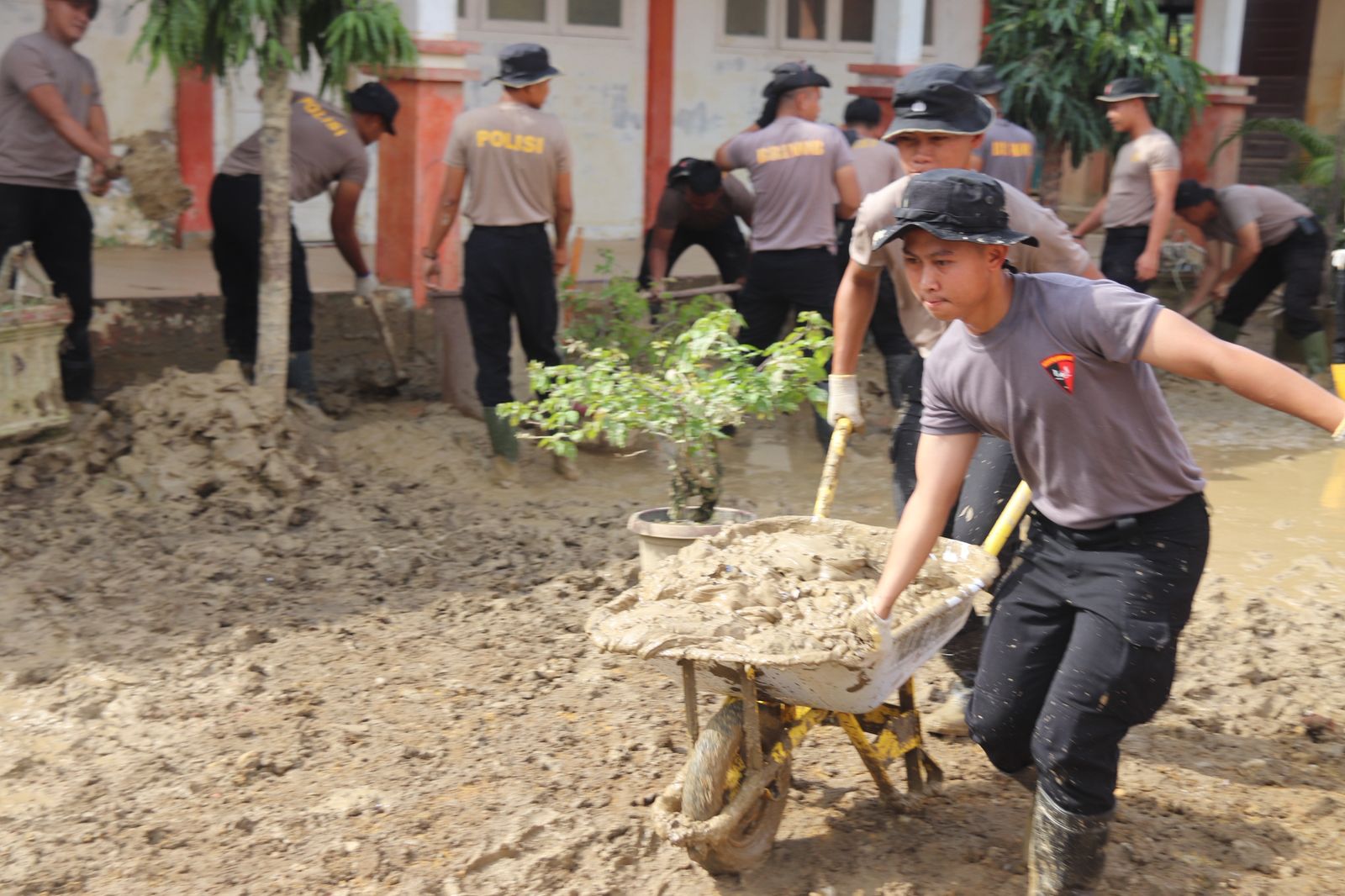 Pembersihan dilakukan dengan menyasar ruang kelas, halaman sekolah, serta fasilitas pendukung lainnya yang terdampak material sisa banjir. Selain itu, personel Brimob juga memberikan bantuan pasir timbun untuk membantu memperbaiki dan meratakan kondisi halaman sekolah agar dapat kembali digunakan.