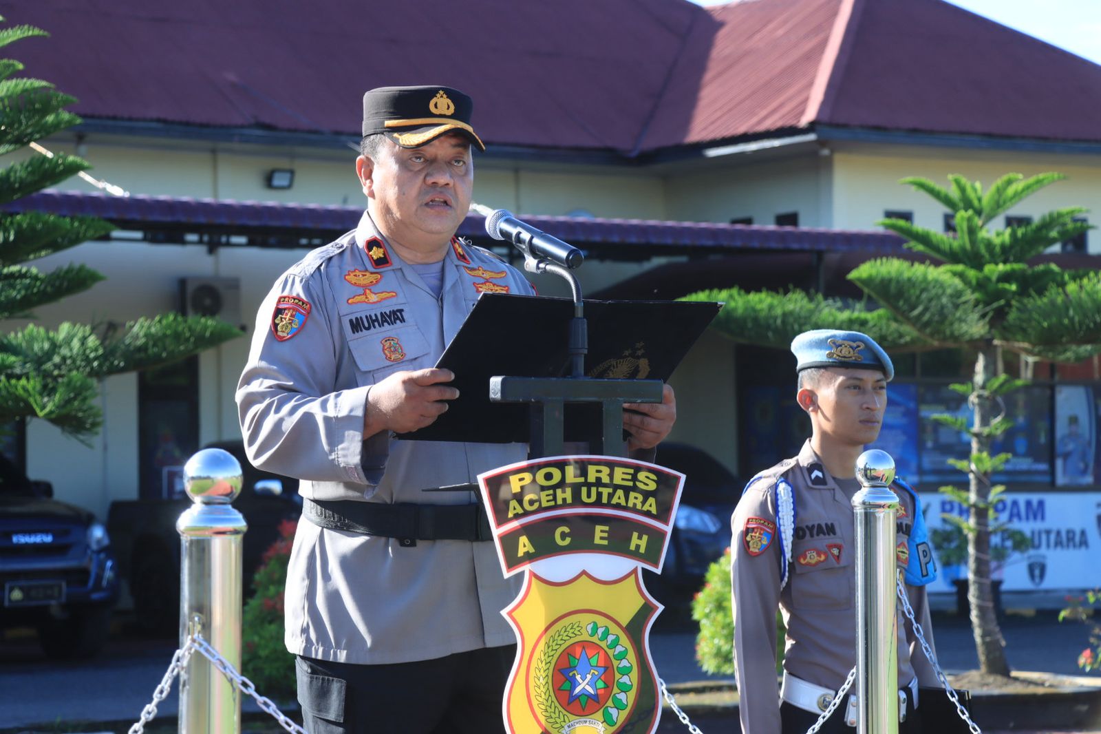 Upacara tersebut berlangsung khidmat dan tertib, diikuti oleh para pejabat utama Polres Aceh Utara serta seluruh personel yang dipimpin oleh Wakapolres Aceh Utara, Kompol Muhayat Effendie.