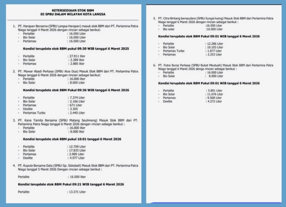 Setelah dilakukan konfirmasi ke pihak Pertamina Patra Niaga, distribusi pasokan BBM dari Pertamina Patra Niaga ke SPBU di Wilayah Kota Langsa dilakukan setiap hari.