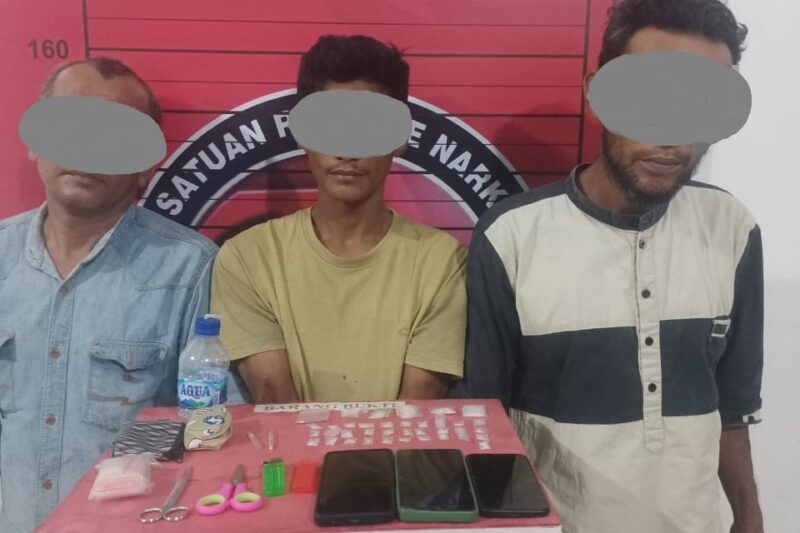 Aceh Utara | Atjeh Terkini.id – Satuan Reserse Narkoba (Sat Res Narkoba) Polres Aceh Utara berhasil mengungkap tindak pidana narkotika dengan menangkap tiga pria yang diduga sebagai pengedar sabu. Dalam penangkapan ini, petugas turut mengamankan 37 paket sabu siap edar dengan berat bruto mencapai 14,69 gram.