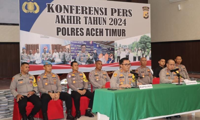 Aceh Timur | Atjeh Terkini.id – Penghujung tahun 2024 ini, Polres Aceh Timur, Polda Aceh menggelar Konferensi Pers Capaian Kinerja Tahun 2024 yang dipimpin langsung oleh Kapolres Aceh Timur, AKBP Nova Suryandaru, S.I.K. dengan didampingi Wakapolres Kompol Iswar, S.H. serta para Pejabat Utama Polres Aceh Timur. Konferensi Pers yang berlangsung di Aula Bhara Daksa pada Selasa (30/12/2024) pagi ini turut dihadiri sejumlah wartawan dari media cetak, elektronik dan online.