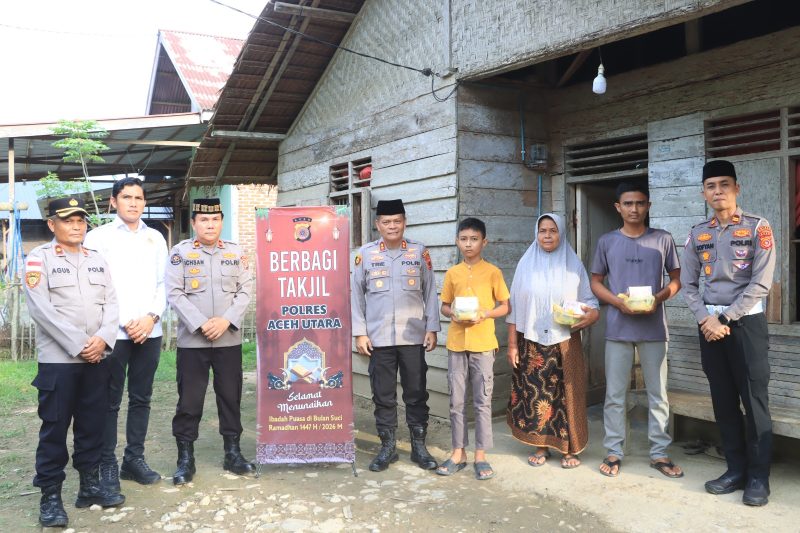 Aceh Utara | Atjeh Terkini.id – Dalam semangat berbagi di bulan suci Ramadhan, Polres Aceh Utara melaksanakan kegiatan pembagian takjil gratis secara door to door kepada masyarakat di Gampong Alue Tingkeum, Kecamatan Lhoksukon, Kabupaten Aceh Utara, Selasa (3/3/2026).
