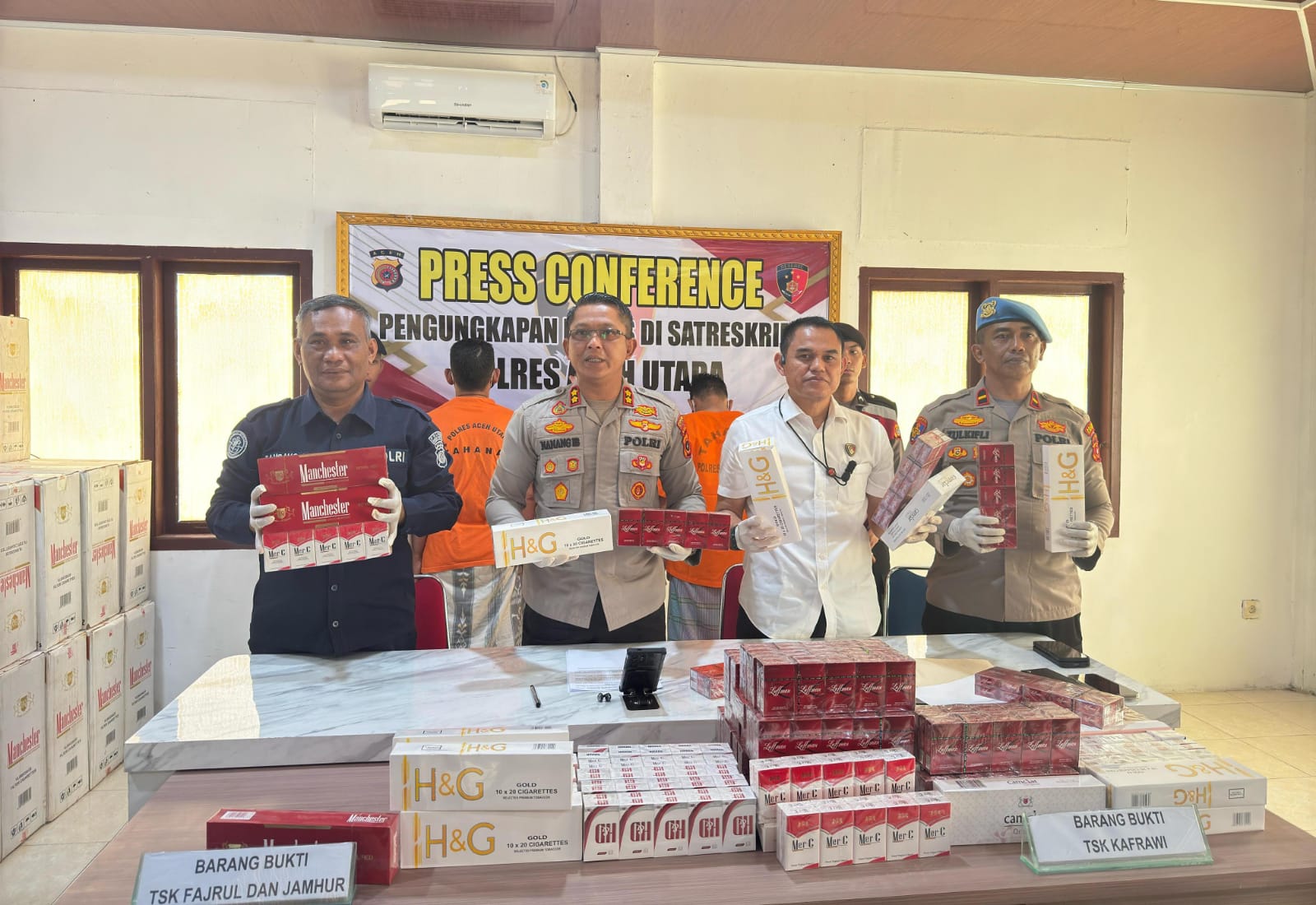 Aceh Utara | Atjeh Terkini.id – Polres Aceh Utara berhasil mengungkap kasus peredaran rokok ilegal tanpa peringatan kesehatan, dengan mengamankan tiga tersangka utama dalam operasi yang berlangsung di dua kecamatan berbeda di Aceh Utara. Hal ini disampaikan langsung oleh Kapolres Aceh Utara, AKBP Nanang Indra Bakti, S.H., S.I.K didampingi Kasat Reskrim AKP Dr. Boestani, S.H., M.H., M.S.M dalam konferensi pers di Mapolres Aceh Utara, Rabu (30/04/2025).