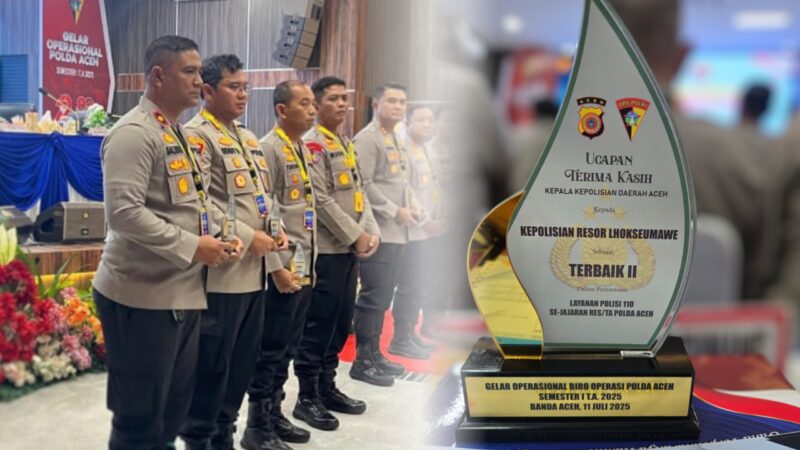 Banda Aceh | Atjeh Terkini.id – Polres Lhokseumawe kembali menorehkan prestasi membanggakan dengan meraih penghargaan sebagai peringkat kedua terbaik dalam lomba layanan Polisi 110 se-jajaran Res/Ta Polda Aceh. Penghargaan tersebut diberikan dalam acara Gelar Operasional Biro Operasi Polda Aceh Semester I Tahun 2025 yang digelar di Mapolda Aceh, Jum’at pagi (11/07/2025).