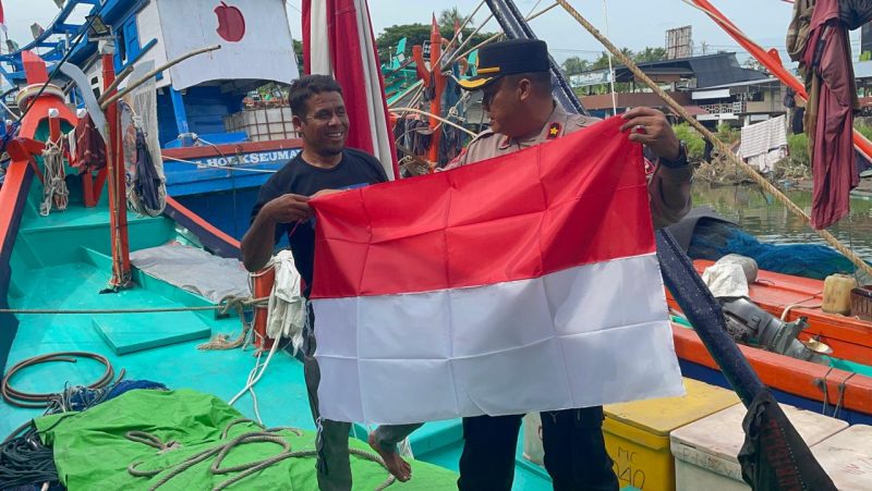 PIDIE JAYA I Atjeh Terkini.Id- Polres Pidie Jaya menggelar aksi pemasangan bendera Merah Putih di kapal nelayan yang berlabuh di Kuala Lhok Meureudu, Kecamatan Meureudu, Kabupaten Pidie Jaya, Sabtu pagi (16/8/2025).