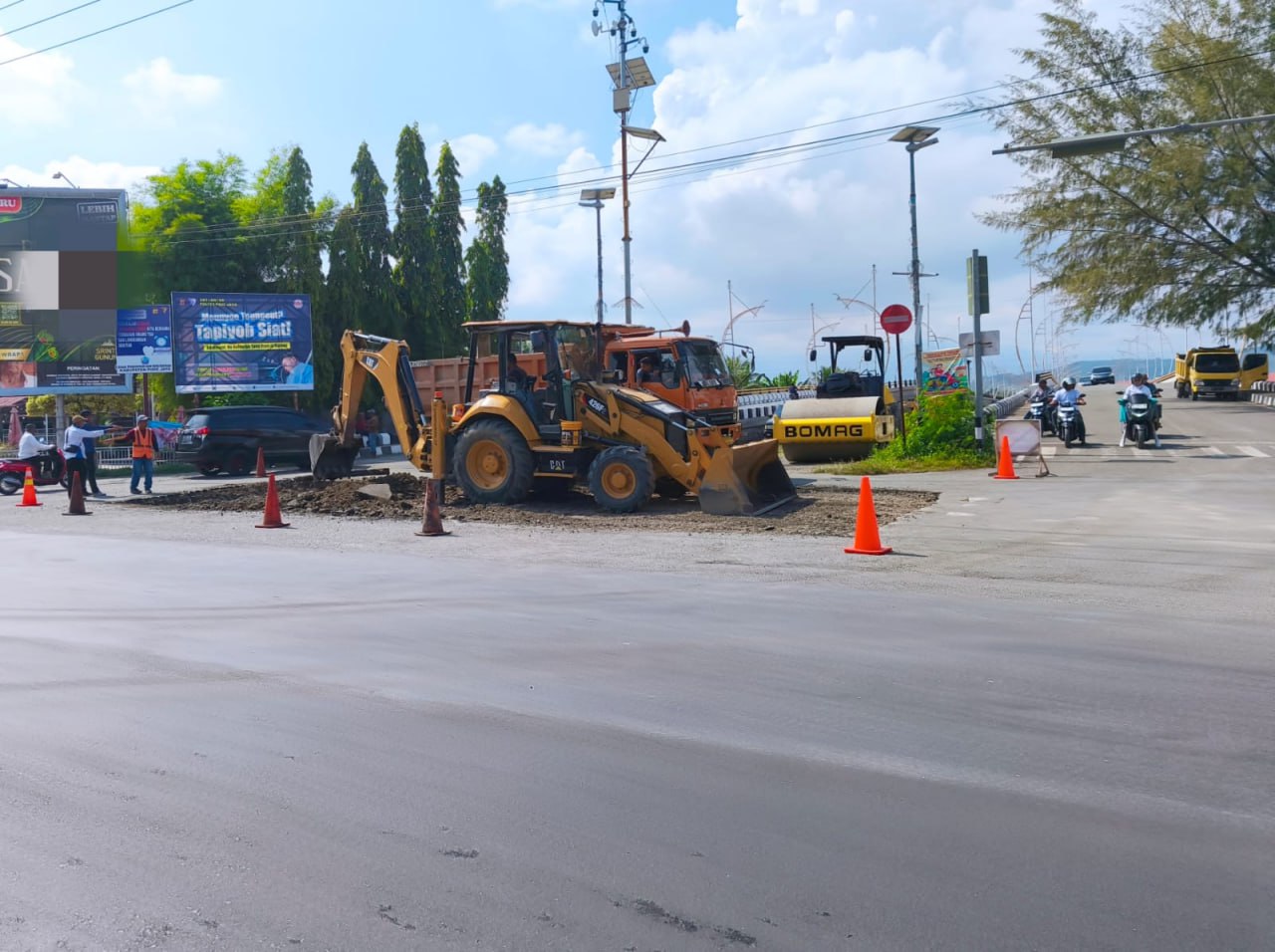 Pantauan di lapangan menunjukkan bahwa Dinas PUPR Aceh fokus pada renovasi badan jalan yang rusak, termasuk di area pintu masuk menuju komplek Pemkab Pidie Jaya, pada 19 Oktober 2025.