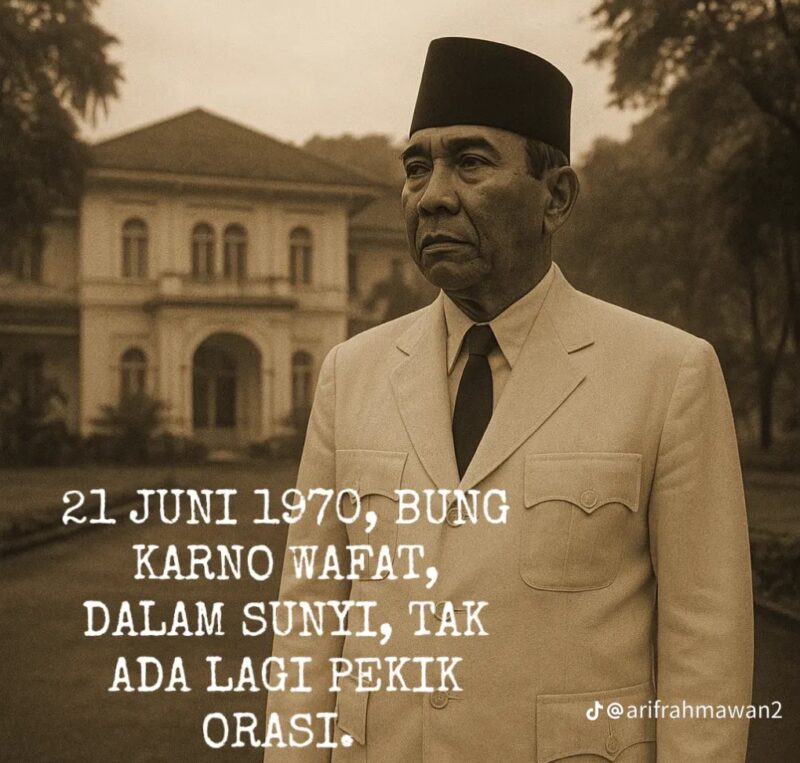 Tak ada seremoni negara, tak ada pidato perpisahan. Sang proklamator yang dulu mengguncang dunia dengan pekik “merdeka” itu kini berpulang dalam status tahanan politik.