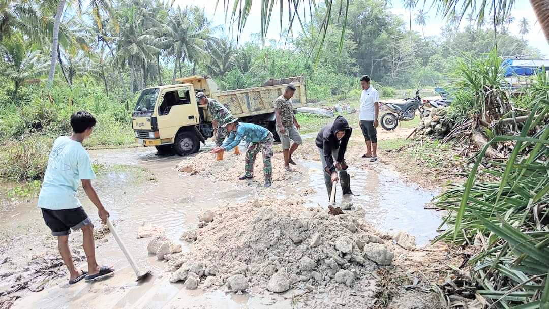 Simeulue I Atjeh Terkini.id – Personil Satgas TMMD Reguler Ke-122 Kodim 0115/Simeulue bersama masyarakat meratakan timbunan jalan sasaran fisik TMMD yang kedua yakni ruas jalan Desa Nasreuhe menuju Desa Lewak dan Sibigo, kegiatan dilaksanakan di Desa Langi Kecamatan Alafan, Jum’at (18/10/2024).
