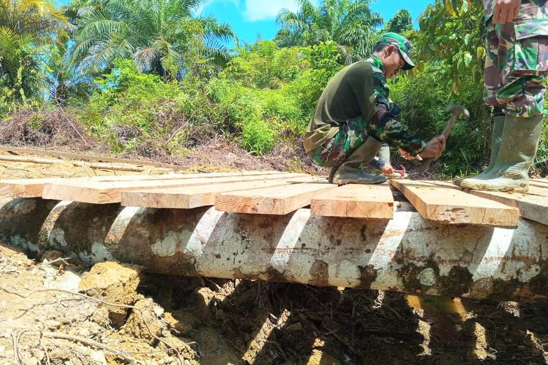 Seperti yang terlihat, tampak prajurit TNI tanpa kenal lelah mengerjakan sasaran fisik pembuatan jembatan tersebut yang mana saat ini progres pembangunan jembatan tersebut telah mencapai 70 persen.