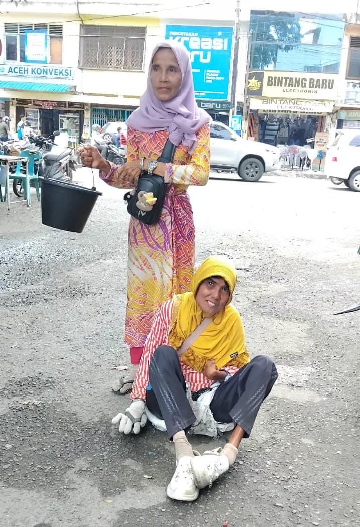 Wanita Disabilitas Nursiah (48) warga Komplek perumahan Gampong Neuheun Aceh Besar di temani kakak kandung Asnita setiap kali ia telusuri kawasan padat di lintasi beragam kenderaan rawannya kecelakaan.