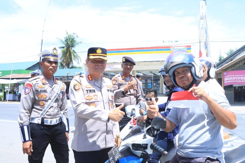 Aceh Utara | Atjeh Terkini.id – Dalam rangka menyemarakkan Hari Ulang Tahun ke-80 Kemerdekaan Republik Indonesia, Polres Aceh Utara melaksanakan kegiatan pembagian dan pemasangan bendera Merah Putih kepada pengguna jalan, Selasa (05/08/2025). Kegiatan tersebut dipimpin langsung oleh Kapolres Aceh Utara AKBP Trie Aprianto, S.H., M.H.