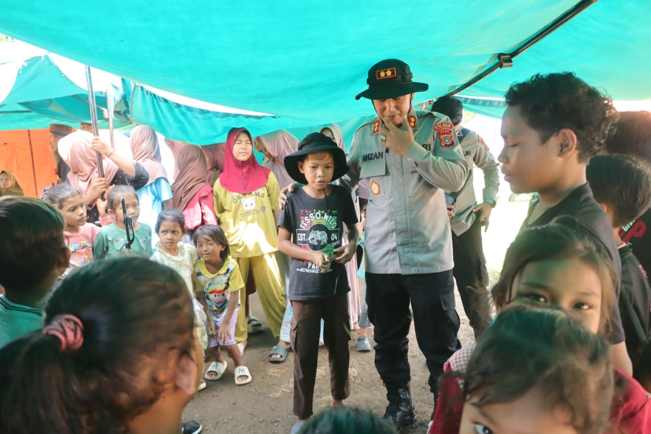 Kapolres juga berbaur dengan anak-anak di lokasi pengungsian. Ia mengajak mereka berbincang, memberi motivasi, dan menyemangati agar tetap ceria menjalani hari-hari di bulan suci. Di tengah keterbatasan, senyum anak-anak yang kembali merekah menjadi gambaran bahwa perhatian dan kehadiran aparat sangat berarti.