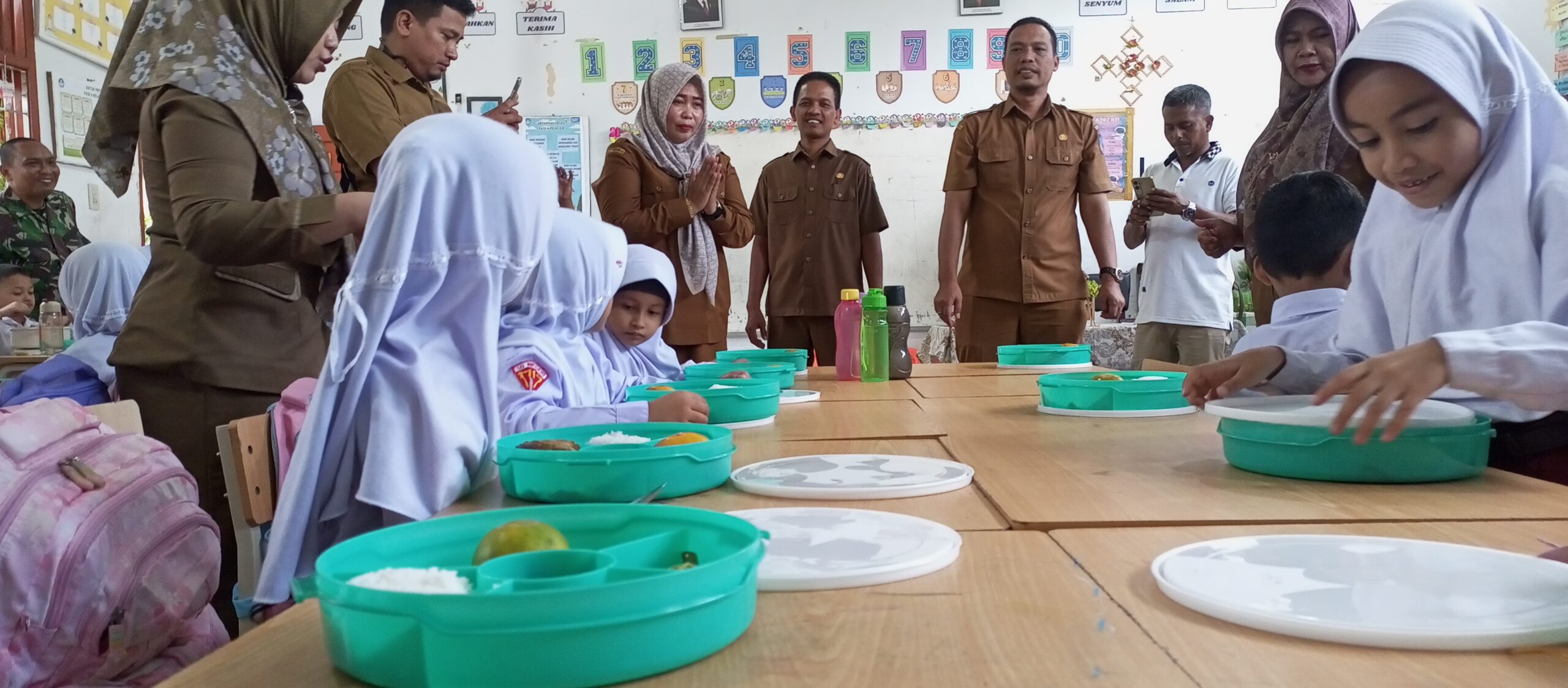 Sejumlah siswa duduk rapi dalam kelas, sejumlah petugas terdiri dari pihak sekolah termasuk Kadis Dikbud dan pihak lainnya ikut membagikan makanan.