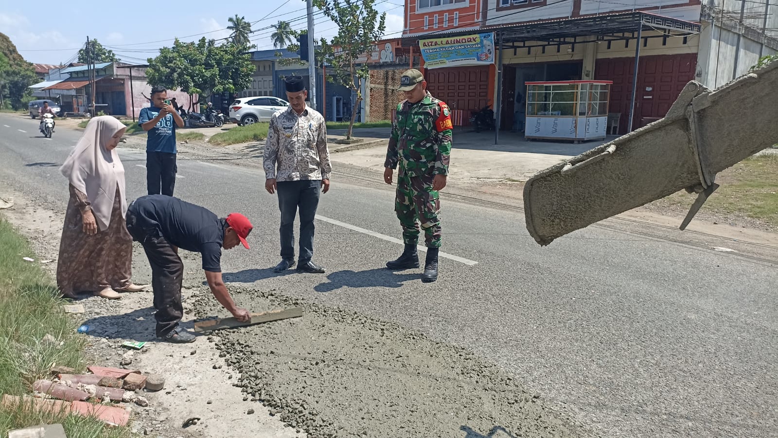 proses penambalan jalan juga melibatkan aparatur kecamatan serta dukungan masyarakat sekitar yang turut membantu kelancaran pekerjaan di lapangan.