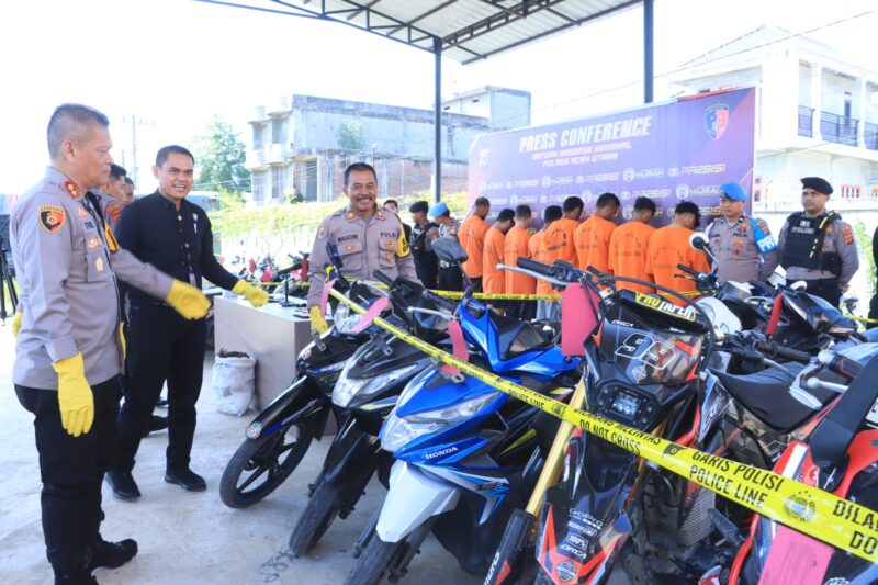 Aceh Utara | Atjeh Terkini.id – Satuan Reserse Kriminal (Sat Reskrim) Polres Aceh Utara berhasil mengungkap kasus pencurian kendaraan bermotor (curanmor) dengan mengamankan tiga orang tersangka warga Aceh Utara. Dalam kasus ini, polisi juga menyita 32 unit sepeda motor berbagai jenis sebagai barang bukti.