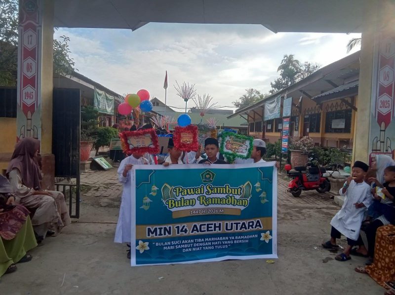 Aceh Utara | Atjeh Terkini.id – Madrasah Ibtidaiyah Negeri (MIN) 14 Aceh Utara menggelar kegiatan Tarhib Ramadhan 1447 Hijriyah dengan meriah dan sarat makna. Dalam rangka menyambut bulan suci Ramadhan yang sudah di ambang pintu, para murid dan guru turut serta dalam pawai yang mengelilingi jalan pusat ibu kota kabupaten Aceh Utara, Lhoksukon hingga ke lintas jalan nasional dengan pengawalan dan pengaman oleh Satlantas Polres Aceh Utara di sepanjang titik atau rute yang dilewati, Kamis (12/02/2026) pagi.