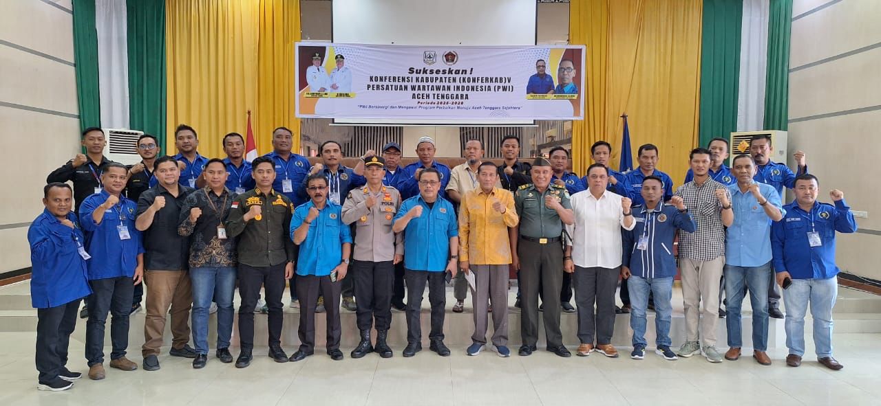 Forkopimda Aceh Tenggara foto bersama dengan Pengurus PWI Aceh, Pengurus PWI Aceh Tenggara periode 2022-2025, anggota, dan Panitia Pelaksana Konferkab V di Oproom Setdakab Aceh Tenggara, Sabtu, 22 Februari 2025. (Dok PWI Aceh/Abdul Hadi)